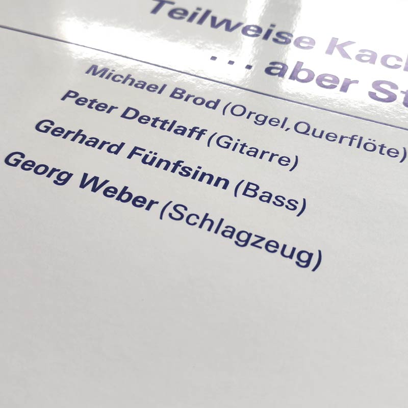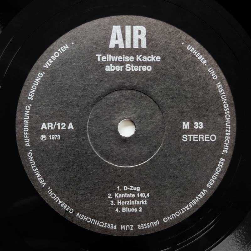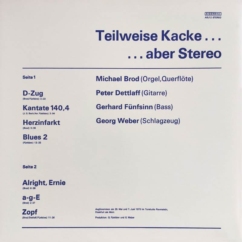 Another obscure German band about which virtually nothing is known and which left behind only one album. The quartet from the Frankfurt region consisted of Michael Brod (org, fl), Gerhard Fünfsinn (b), Georg Weber (dr) and guitarist Peter Dettlaff, who later joined the band AG a.m.. They recorded their first and only self-produced LP with the bizarre title Teilweise Kacke... ...Aber Stereo (Partly shit... ...But Stereo) over two days at the end of May/beginning of June 1973 at the Ravenstein recording studio in Frankfurt. Unlike the experimental Krautrock of the time with its complex arrangements, the band presented a modest instrumental album with relaxed improvisations and a certain minimalism, which is also reflected in the cover design. The dominant, somewhat old-fashioned sounding organ, as well as the flute, which at times incorporated classical elements, are more reminiscent of the early days of progressive rock. The electric guitar was mainly used for rhythm accompaniment and dispensed with any rock effects.