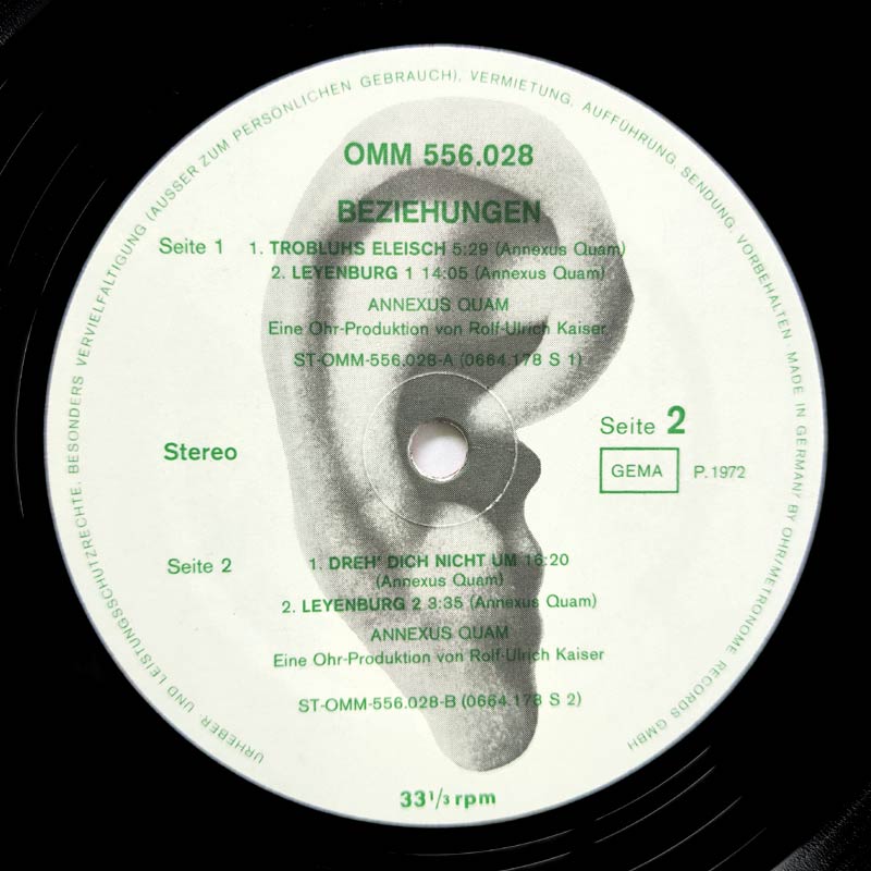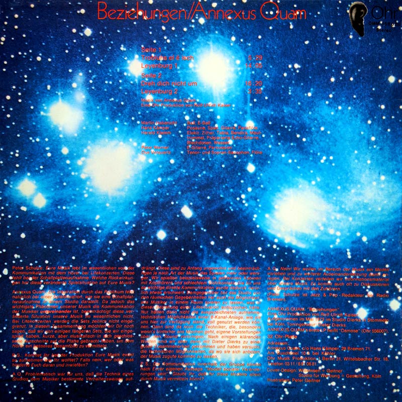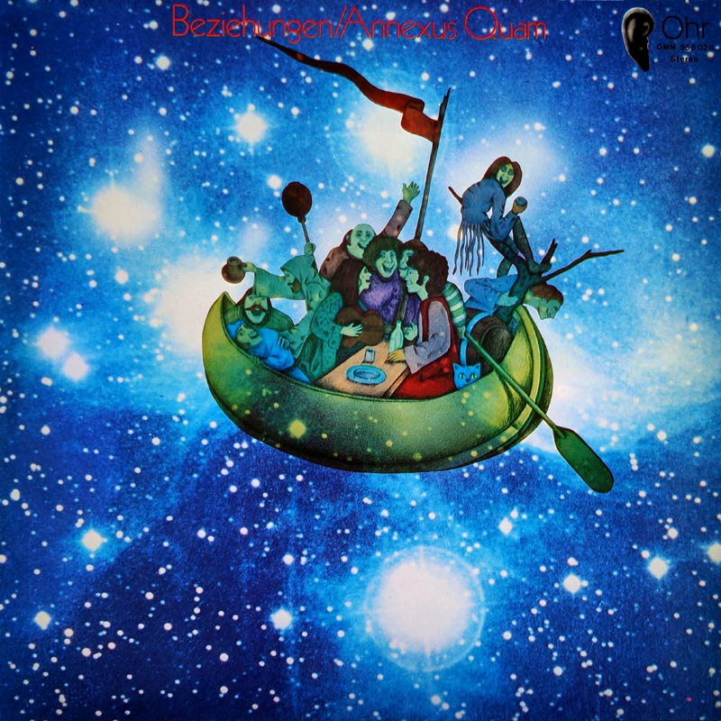 Unlike their debut album Osmose, the band Annexus Quam recorded their second and final LP Beziehungen as a five-piece. Werner Hostermann (cl, org, voc, perc), Jürgen Jonuschies (b, voc, perc) and Uwe Bick (dr, voc, perc) left the group and Martin Habenicht (bass) joined. This was accompanied by a radical change in their jazz-influenced psychedelic Krautrock. On this album, the band abandoned a fixed rhythm provided by drums and percussion. Instead, bringing free jazz to the fore with prominent tenor and soprano saxophones and the unusual use of the trombone in favour of a predominantly free and experimental improvisational style. The rich and unique instrumentation, including trombone, pan flute, electric zither, Spanish guitar, tabla, bendir, jaw harp and prepared guitar, significantly supported the avantgarde potential. In contrast to many German bands with their uncommercial and eccentric releases, which over time adapted their music to a larger audience, Annexus Quam, entirely committed to the avant-garde, became even more cosmic and free, without any formal structures.