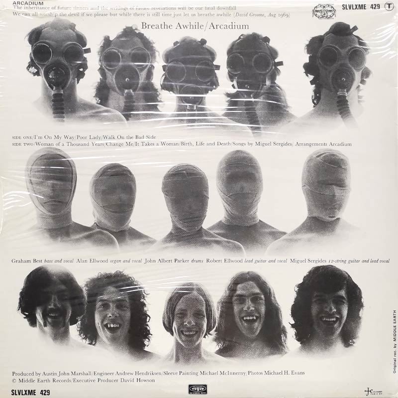 The short-lived band Arcadium was formed in London in 1969 and consisted of band leader, songwriter, guitarist and singer Miguel Sergides, Robert Ellwood (g, voc), Allan Ellwood (org, voc), Graham Best (b, voc) and John Albert Parker (dr). After several successful club performances, they were signed by the small British label Middle Earth Records. Their album Breath Awhile, produced and released there in 1969, is now considered a milestone of late 1960s British psychedelic rock with early prog and hard rock influences. Their first and only LP is dominated by a gloomy, cathedral-like organ, distorted guitar and painful vocals, which lend the sound an apocalyptic atmosphere. Despite the intensity of the music, the tortured vocals and the heavy, nightmarish sounds that perfectly captured the mood of the late 1960s, the LP sank without a trace.