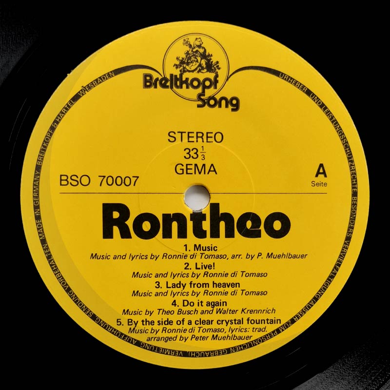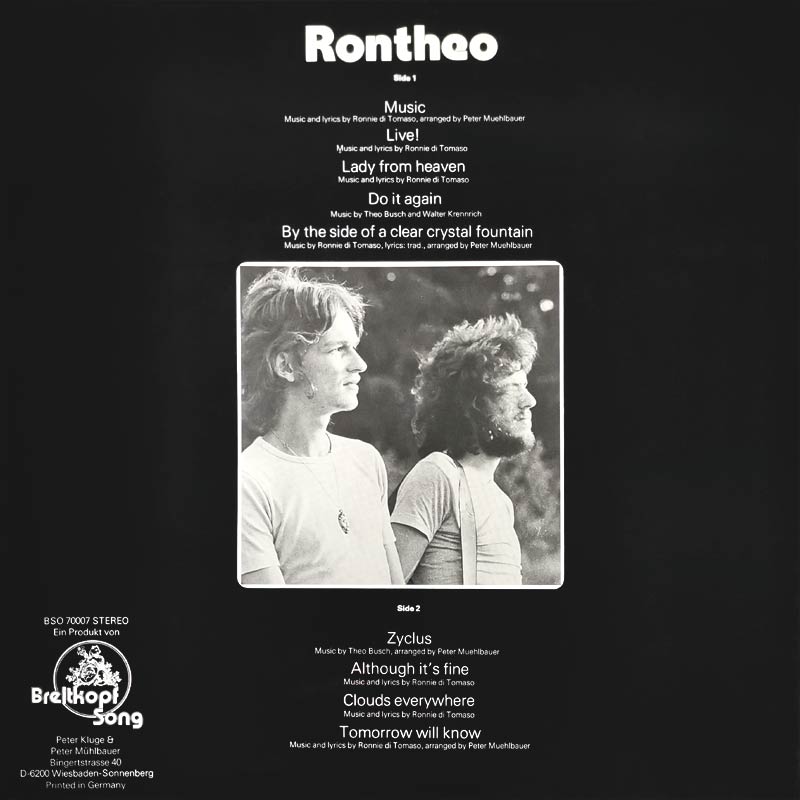 A rare folk rock gem from Germany by the duo Ronnie di Tomaso (g, voc) and Theo Busch (vln, g, perc), who called themselves Rontheo, a combination of their first names. About a year after they met, they were offered the chance to record an album. They received access to the Breitkopf & Härtel Studio in Taunusstein, a fully equipped 24-track recording studio, which explains the outstanding sound quality. With the support of guitarist Yedz and composer Peter Mühlbauer, who wrote the vocal arrangements and was also the producer, they recorded their self-titled album in 1976. Thanks to Canadian Ronnie di Tomaso, they sounded more like an American folk rock band with no connection to the local Krautrock scene. Melodic folk rock with subtly accentuated acoustic guitars, instrumental passages with violin solos and driving guitar riffs, as well as soulful vocals (in English) give the album its unique and special character.