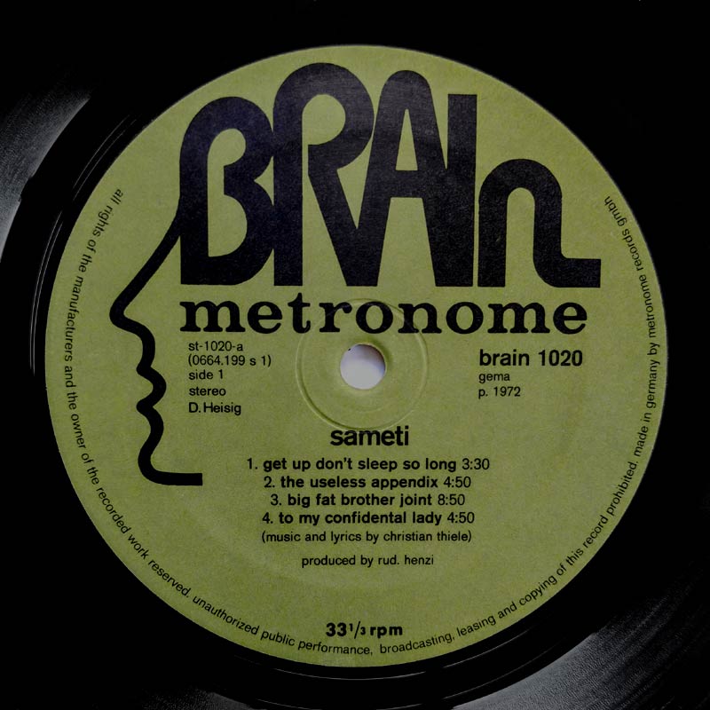 Sameti was a band from Munich, formed in 1971 on the initiative of percussionist and singer Christian „Shrat“ Thiele after he left Amon Düül (later Amon Düül II). In April 1972, with the support of guest musicians Robert Eliscu (ob, fl) and Jürgen Benz (sax), they recorded their debut album at Bavaria Music Studios. The band members at the time of recording were Walter Bratengeier (g), Eckart Voggenreiter (b, g) and Klaus Götzner (dr). They offered a rather experimental approach that leaned towards cosmic Krautrock, but was based on bluesy hard rock with a few psychedelic and progressive influences provided by saxophone and flute.